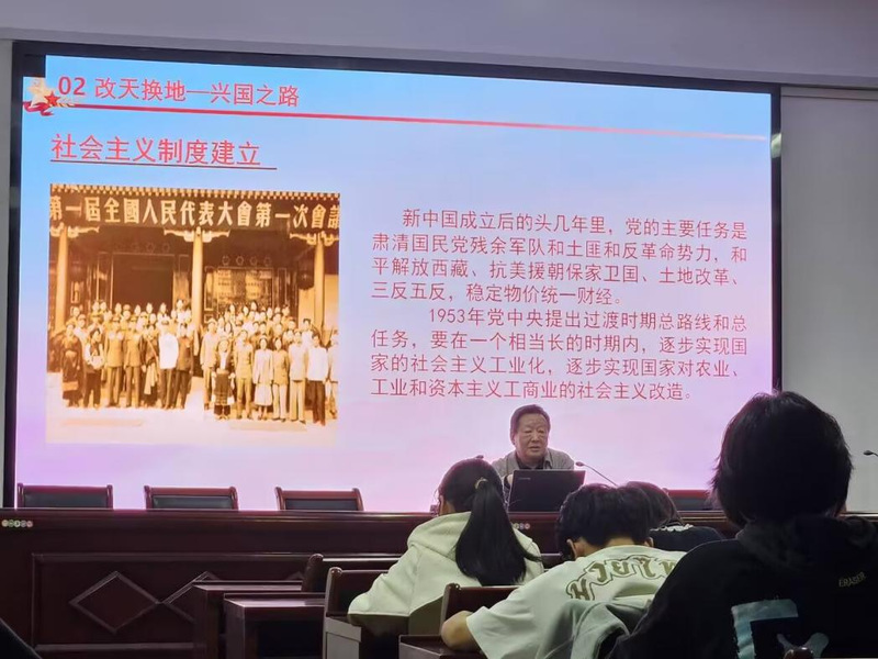 党课上,邵卫旭老师以关工委老同志的身份,从伟大建党精神形成的基础和条件切入,条理清晰地为同学们梳理了共产党精神形成的时代背景、理论来源、实践基础和文化土壤,带领大家深刻领悟党的伟大精神和光荣传统。他还结合革命烈士、英雄人物及忘我奉献先进模范的感人事迹,生动展现了中国共产党人艰苦奋斗、牺牲奉献、开拓进取的伟大品格,用真挚的情感和鲜活的案例,为在场青年学子注入了强大的精神动力。