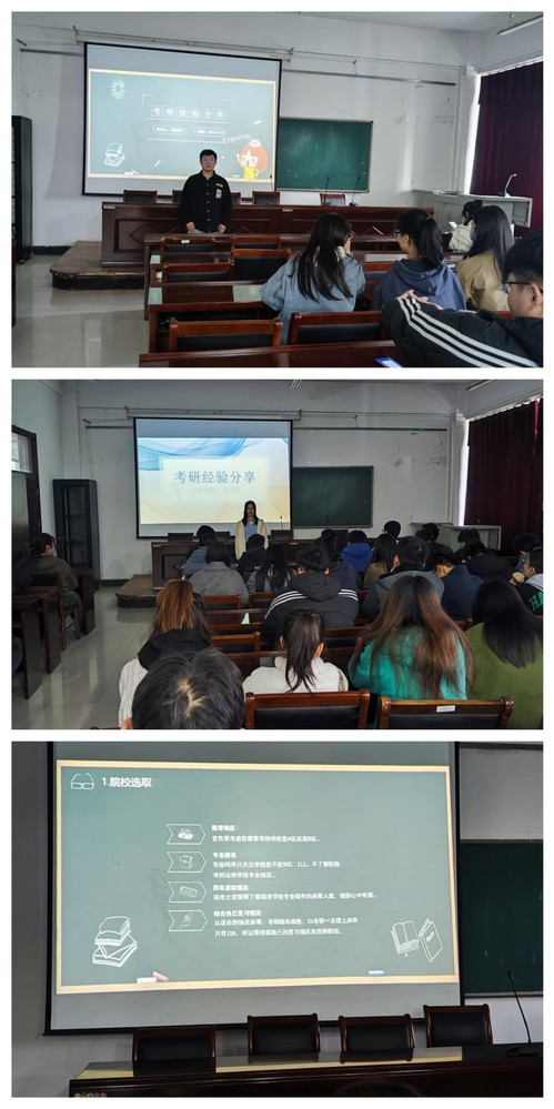 本次活动旨在帮助学生明确考研方向及目标,激发动力,传授经验。分享会拉近了各年级专业同学的距离,为考研同学指明了前进的道路,对今后的学习指导具有重要的意义。