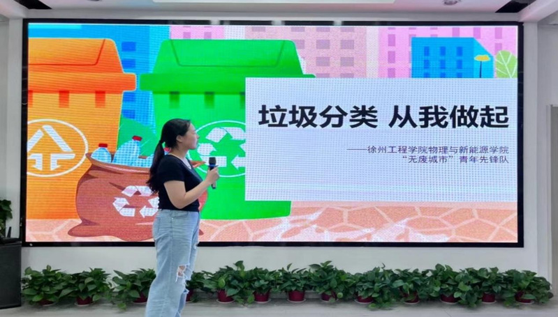 “垃圾分类”实践团队以垃圾分类为切入点,立足于徐州市“无废城市”建设调研,开展“无废城市”科普活动入学校、进社区、下基层,结合专业所长,开展环保知识普及、采访调研等丰富多彩的志愿服务活动,引导更多青年学生了解“无废城市”建设,贯彻落实创新和绿色发展新理念,形成绿色低碳、文明健康的生活方式,助力生态优先战略落地落实。在社区的垃圾分类管理处,实践队员对社区垃圾分类情况开展社会调研和知识宣讲,提高居民垃圾分类意识,广泛动员全民参与“无废城市”建设,让更多人感受到生态文明建设功在当代,利在千秋。