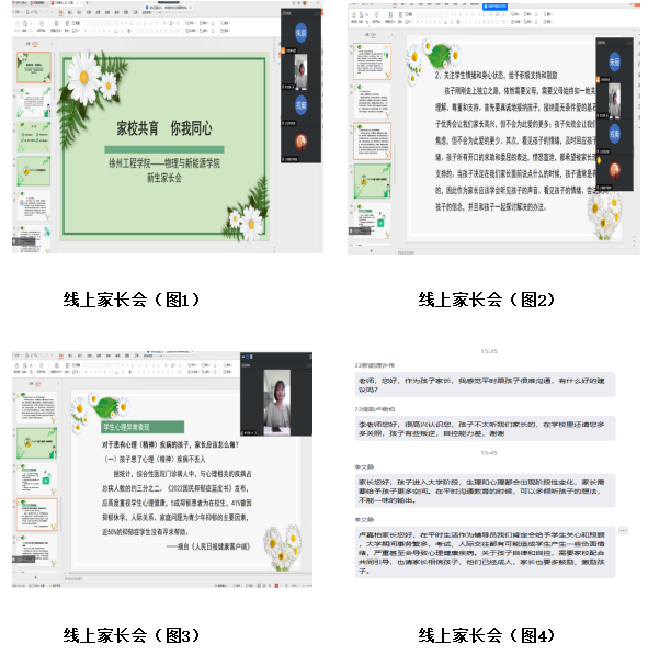 本次线上家长会的目的是通过家校共育,更好的为学生创设良好的心理成长环境。学院将继续把重点工作放在平时,努力营造良好的心理健康成长环境,优化学院资源配置,对学院心理健康站成员进行技能培训,大力宣传省大学生24小时热线和“苏心”APP,畅通学生求助渠道、大学生24小时心理热线(025-58255200)和“苏心”APP。持续推送我校求助渠道: 7790必发集团心理健康教育中心“微信公众号”(8:00-17:00)“即时咨询”版块进行文字、语音、视频咨询:徐老师QQ :1034242593心理支持热线。