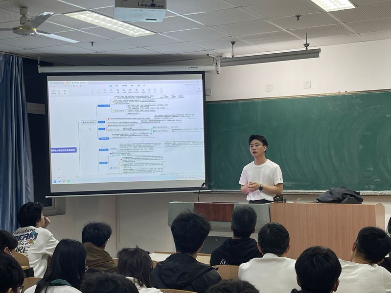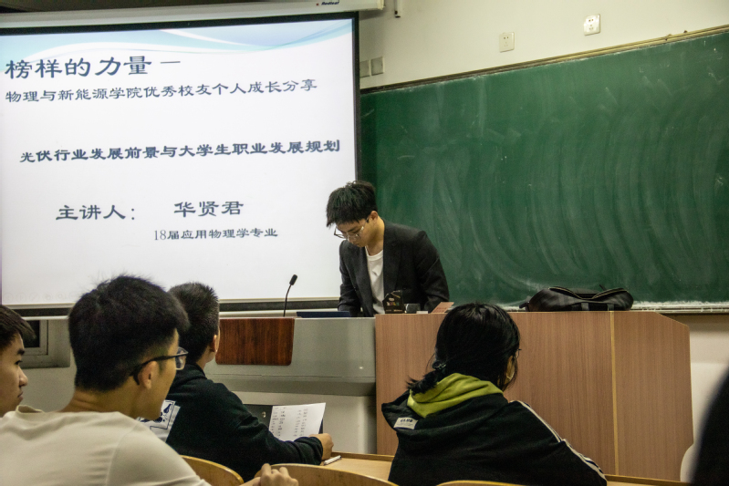 分享会上,华贤君向大家分享了自己从学生到职场人的转型经历,鼓励同学们要合理规划大学四年,勇于展现自我。随后,围绕光伏行业的发展前景与大学生职业发展规划和大家进行了分享,他用他自己的亲身经历告诉在座同学要以终身学习为目标,敢想敢做,矢志不渝地去追求实现梦想的舞台。在谈到“人生规划”与“学业漫路”时,华贤君指出在目前大环境趋势下,无论是考研还是就业,都要结合自身实际深入思考与分析,明确目标,提升自身的竞争力。他鼓励在座同学珍惜在校时光,关注自我成长,确定目标就坚持不懈!最后他祝福同学们能够调整心态,时刻保持自信,在漫漫求学道路上不断超越自我。