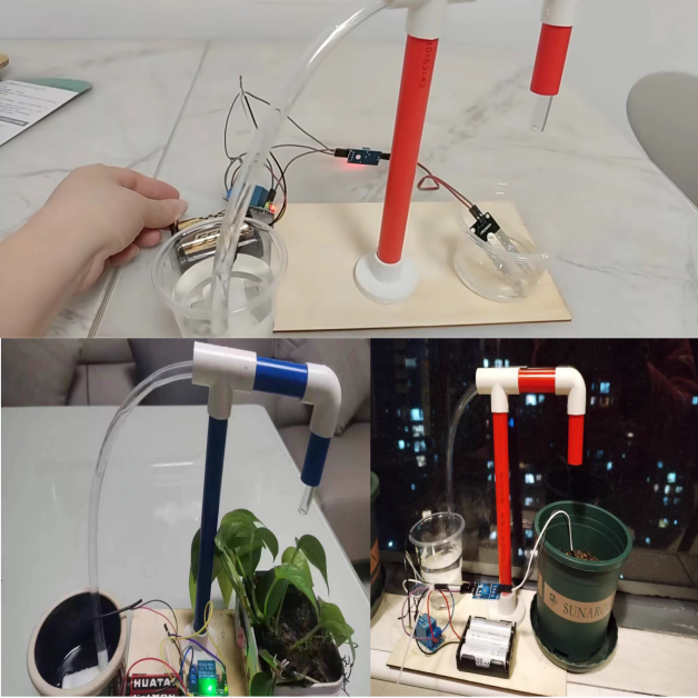 活动中,同学们发挥创意,将物理学与新能源相关知识巧妙融合,自制太阳能滴灌绿植模型。电子协会的同学们不仅积极参与模型的制作,还向同学们详细介绍了模型的设计原理和制作过程。通过太阳能电池板将光能转化为电能,实现了自动滴灌功能,既体现了环保理念,又展现了实际应用价值。